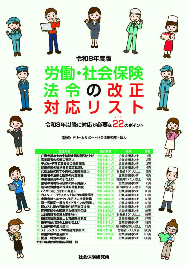 社会保険研究所より、ドリームサポート社会保険労務士法人が監修した『令和8年度版 労働・社会保険法令の改正対応リスト』が令和8年4月に発刊されました。