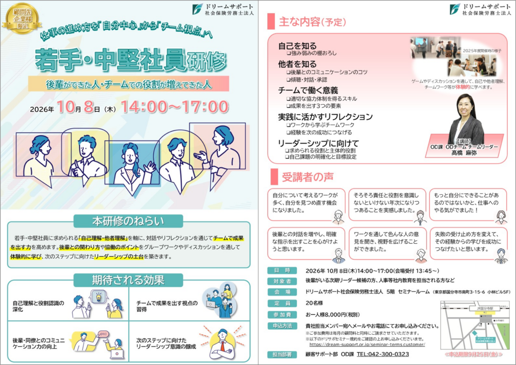 若手・中堅社員に求められる「自己理解・他者理解」を軸に、対話やリフレクションを通じてチームで成果を出す力を高めます。