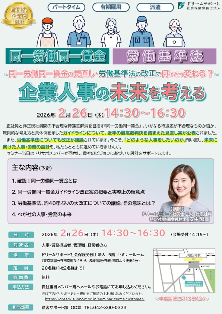 また、労働基準法についても改正が議論されています。今こそ、「どのような人事をしたいのか」問い直し、未来に向けた人事・労務の設計を、私たちとともに進めていきませんか。
