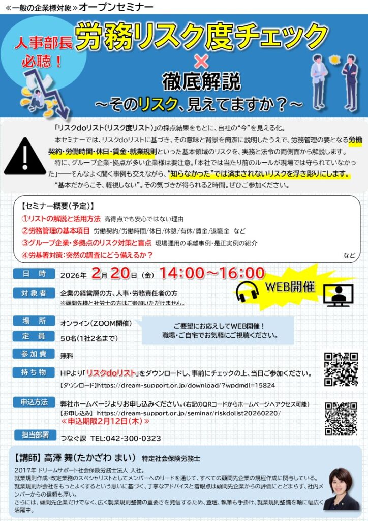 2/20開催 【人事部長必聴!】労務リスク度チェック×徹底解説 ~そのリスク、見えてますか?~
