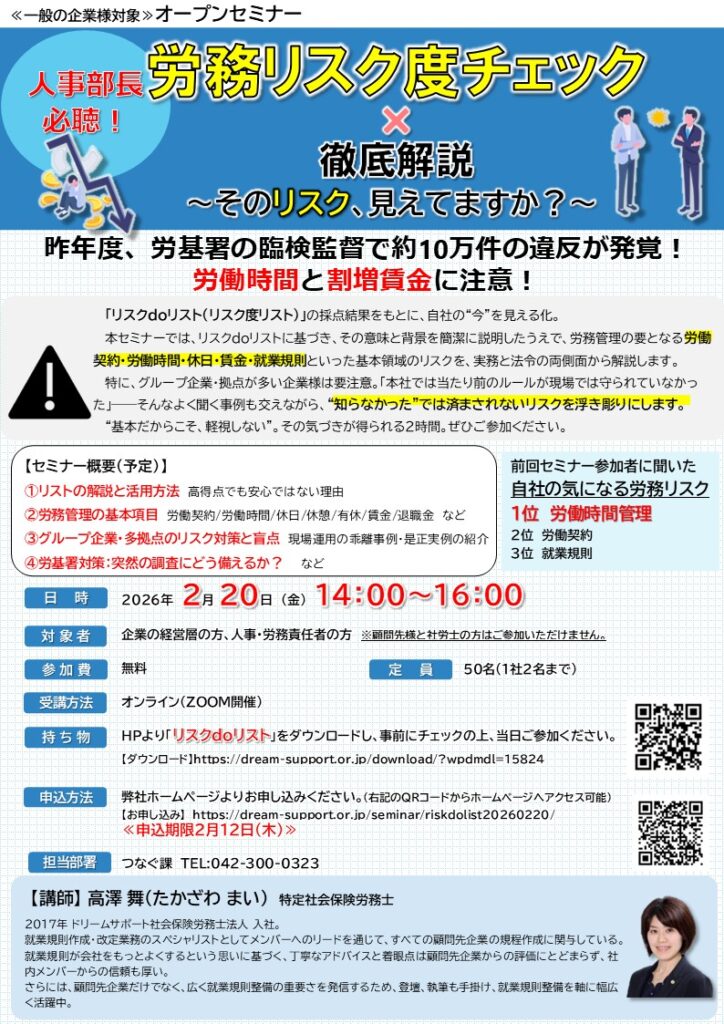 2/20開催 【人事部長必聴!】労務リスク度チェック×徹底解説 ~そのリスク、見えてますか?~