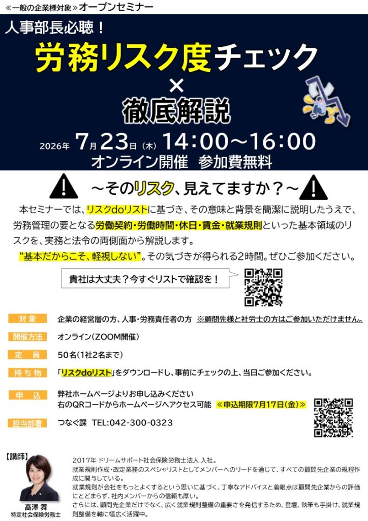 7/23開催 【人事部長必聴!】労務リスク度チェック×徹底解説 ~そのリスク、見えてますか?~